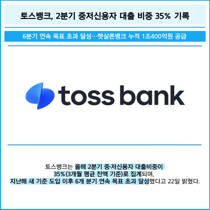 [프라임경제] 토스뱅크는 올해 2분기 중·저신용자 대출비중은 35%(3개월 평균 잔액 기준)로 집계되며, 지난해 새 기준 도입 이후 6개 분기 연속 목표 초과 달성했다고 22일 밝혔다.