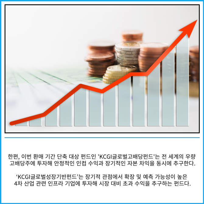 대상 펀드는 KCGI글로벌고배당, KCGI글로벌성장기반, KCGI글로벌채권, KCGI글로벌 리츠로, 총 4종이다. 과거 환매 신청 후 대금 지급까지 8~9영업일이 소요되던 것이 이날부터 5~6영업일로 단축된다.