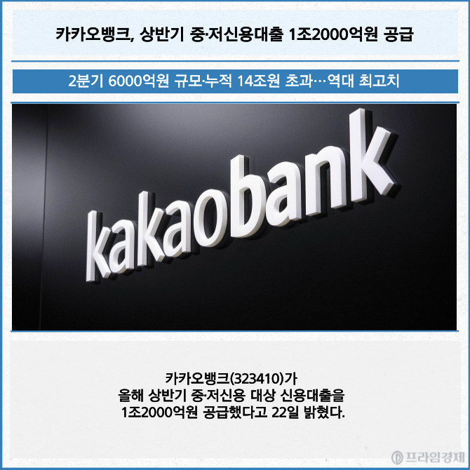 [프라임경제] 카카오뱅크(323410)가 올해 상반기 중·저신용 대상 신용대출을 1조2000억원 공급했다고 22일 밝혔다.