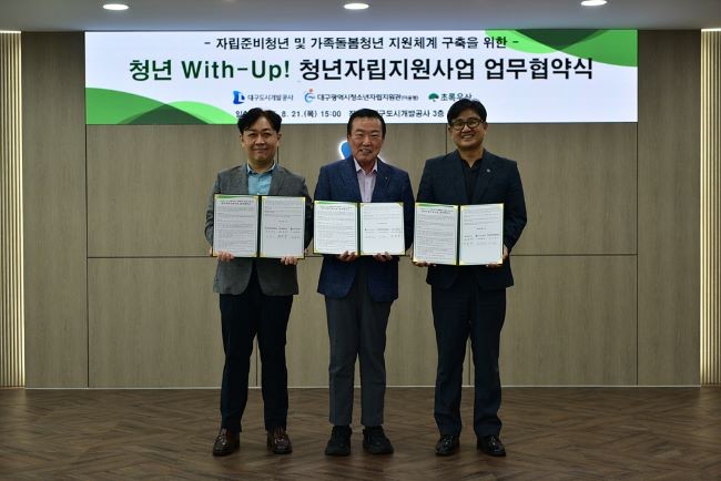 [프라임경제] 대구도시개발공사(사장 정명섭)는 지난 21일, 대구시청소년자립지원관, 초록우산 어린이재단 대구지역본부와 함께 자립준비청년과 가족돌봄청년 지원체계 구축을 위한 '청년 With-Up!' 청년자립 지원사업 업무협약을 체결했다.