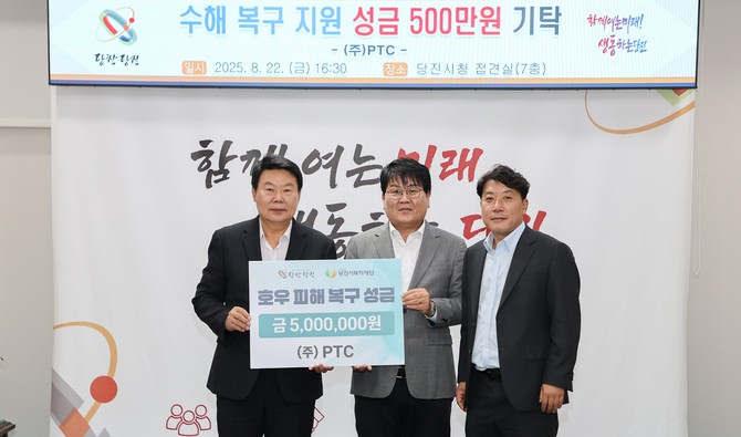 충남 당진시(시장 오성환) 22일 당진시청 7층 접견실에서 ㈜PTC(대표 이권수)가 수해 성금 500만원을 기탁했다고 밝혔다.