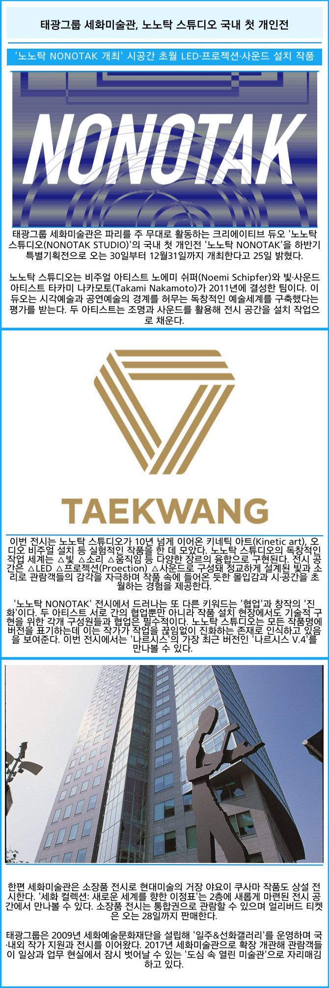 [프라임경제] 태광그룹 세화미술관은 파리를 주 무대로 활동하는 크리에이티브 듀오 '노노탁 스튜디오(NONOTAK STUDIO)'의 국내 첫 개인전 '노노탁 NONOTAK'을 하반기 특별기획전으로 오는 30일부터 12월31일까지 개최한다고 25일 밝혔다.