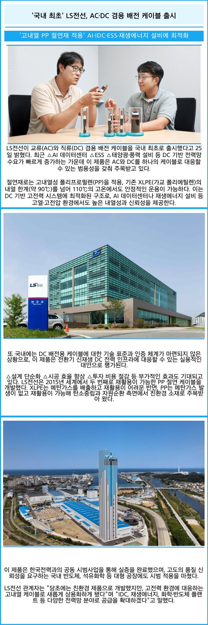 [프라임경제] LS전선이 교류(AC)와 직류(DC) 겸용 배전 케이블을 국내 최초로 출시했다고 25일 밝혔다. 최근 △AI 데이터센터 △ESS △태양광·풍력 설비 등 DC 기반 전력망 수요가 빠르게 증가하는 가운데 이 제품은 AC와 DC를 하나의 케이블로 대응할 수 있는 범용성을 갖춰 주목받고 있다.
