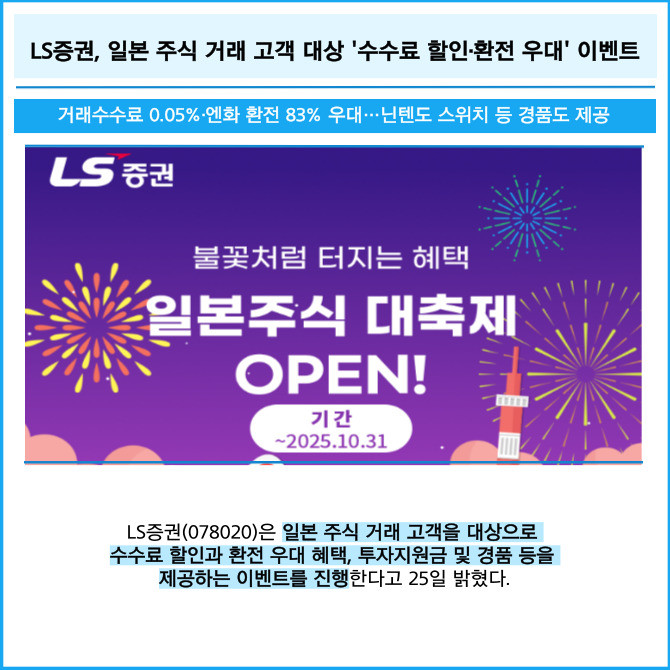 [프라임경제] LS증권(078020)은 일본 주식 거래 고객을 대상으로 수수료 할인과 환전 우대 혜택, 투자지원금 및 경품 등을 제공하는 이벤트를 진행한다고 25일 밝혔다.