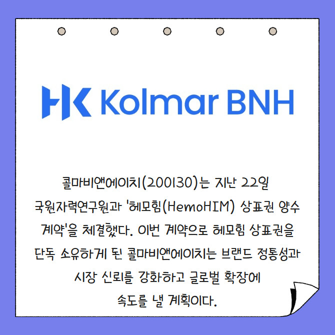 [카드] 콜마비앤에이치, '헤모힘' 상표권 확보…R&D 성장 발판 마련