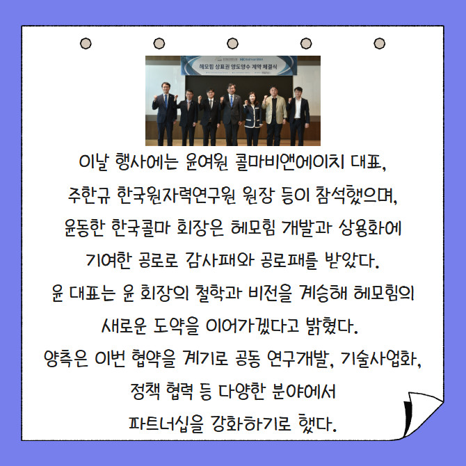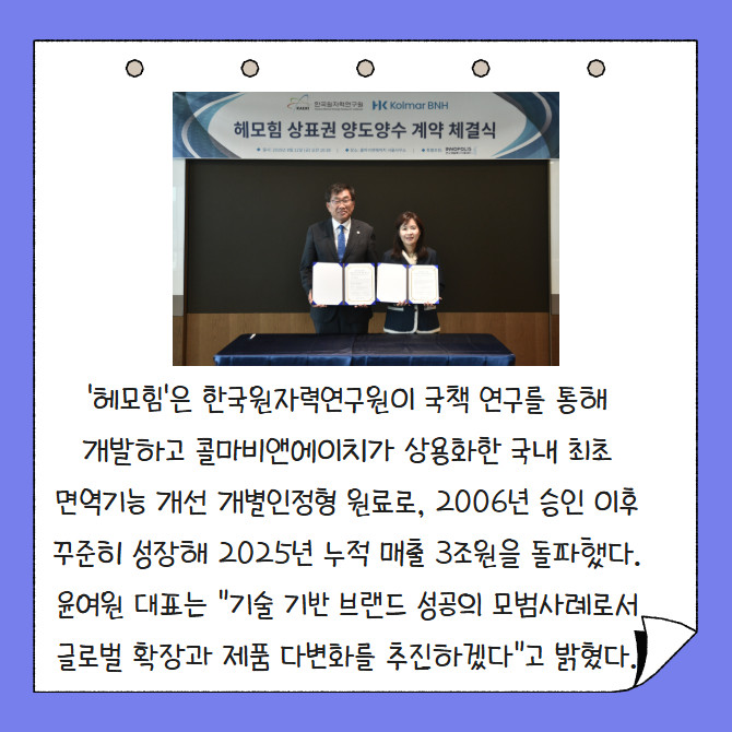 [프라임경제] 콜마비앤에이치(200130)는 지난 22일 한국원자력연구원과 '헤모힘(HemoHIM) 상표권 양수 계약'을 체결했다. 이번 계약으로 헤모힘 상표권을 단독 소유하게 된 콜마비앤에이치는 브랜드 정통성과 시장 신뢰를 강화하고 글로벌 확장에 속도를 낼 계획이다.