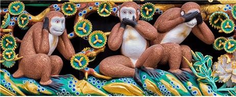 에도막부를 세운 도쿠가와 이에야스를 주신으로 기리는 신사. 세기 어려울 정도로 많은 극채색 조각으로 구성돼 '온종일 보아도 질리지 않는다'는 요메이몬(陽明門), 다양한 동물 목각상 등 국보와 미술 공예품이 즐비하다. 그 가운데 '산자루(三猿)'는 눈·귀·입을 가린 세 마리 원숭이를 통해 "(예를 벗어나면)안 보고, 안 듣고, 말하지 않는다"라는 논어 가르침을 표현하고 있는 것으로 알려진다.