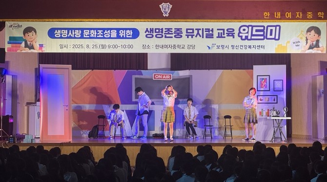 보령시정신건강복지센터는 관내 중학교 3개교 학생 1393명을 대상으로 찾아가는 생명존중 뮤지컬 '위드 미(With Me)' 공연 교육을 진행한다고 25일 밝혔다. 이날은 한내여자중학교와 대천여자중학교에서 공연이 열렸다.