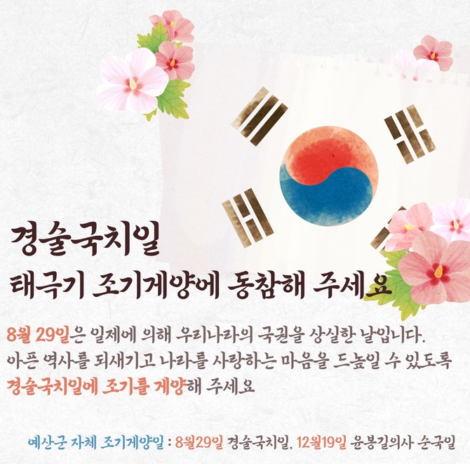 [프라임경제] 충남 예산군은 오는 8월29일 경술국치일을 맞아 '조기(弔旗) 달기 운동'을 전개한다고 25일 밝혔다.