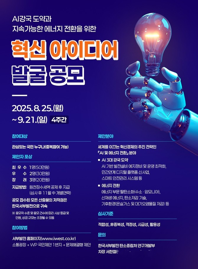 심사는 1·2차 절차를 거쳐 총 6건의 수상작을 선정한다. 최우수상 1명에게는 50만원, 우수상 2명은 각 30만원, 장려상 3명은 각 20만원의 상금이 주어진다. 선정된 아이디어는 향후 서부발전 연구개발 과제로 기획·활용될 예정이다. 공모 결과는 오는 11월 중 서부발전 누리집에 게시된다.