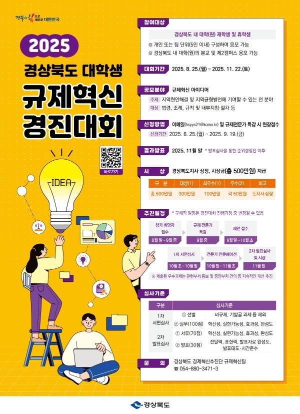 경북도는 경북도 내 대학(원) 재학생과 휴학생을 대상으로 8월25일부터 11월22일까지 '2025 경상북도 대학생 규제혁신 경진대회'를 진행한다.