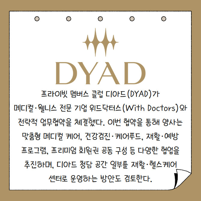 [프라임경제] 프라이빗 멤버스 클럽 디아드(DYAD)가 메디컬·웰니스 전문 기업 위드닥터스(With Doctors)와 전략적 업무협약을 체결했다. 이번 협약을 통해 양사는 맞춤형 메디컬 케어, 건강검진·케어푸드, 재활·예방 프로그램, 프리미엄 회원권 공동 구성 등 다양한 협업을 추진하며, 디아드 청담 공간 일부를 재활·헬스케어 센터로 운영하는 방안도 검토한다.