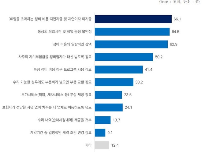 정비업체들이 지적한 불공정 행위로는 30일 초과 대금 지연 지급 및 지연이자 미지급(66.1%)이 가장 많았다. 이어 작업시간·공정 불인정(64.5%), 수리비 일방 감액(62.9%), 차주의 자기부담금 대납 강요(50.2%), 특정 정비비 청구 프로그램 사용 강요(41.4%) 등이 있었다.