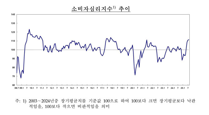 이혜영 경제통계1국 경제심리조사팀장은 "소비 개선과 수출 호조 지속 등의 영향으로 현재경기판단 지수가 오르며 전체 소비심리 지수 상승을 주도했다"며 "반대로 향후경기전망 지수는 미국 관세 부과에 따른 향후 수출 부진 우려 등에 하락했다"고 말했다.