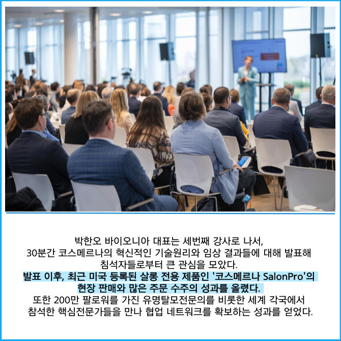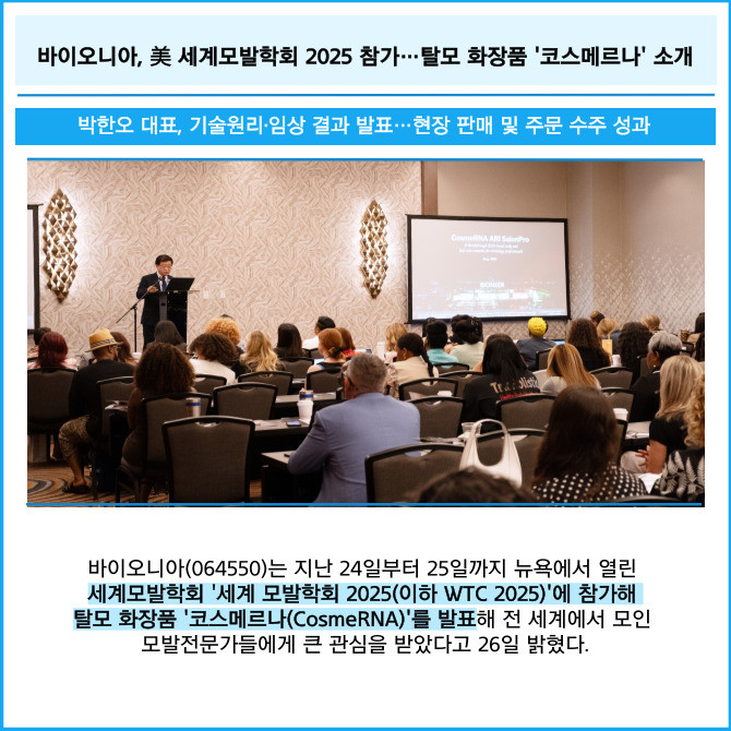 [프라임경제] 바이오니아(064550)는 지난 24일부터 25일까지 뉴욕에서 열린 세계모발학회 '세계 모발학회 2025(이하 WTC 2025)'에 참가해 탈모 화장품 '코스메르나(CosmeRNA)'를 발표해 전 세계에서 모인 모발전문가들에게 큰 관심을 받았다고 26일 밝혔다.
