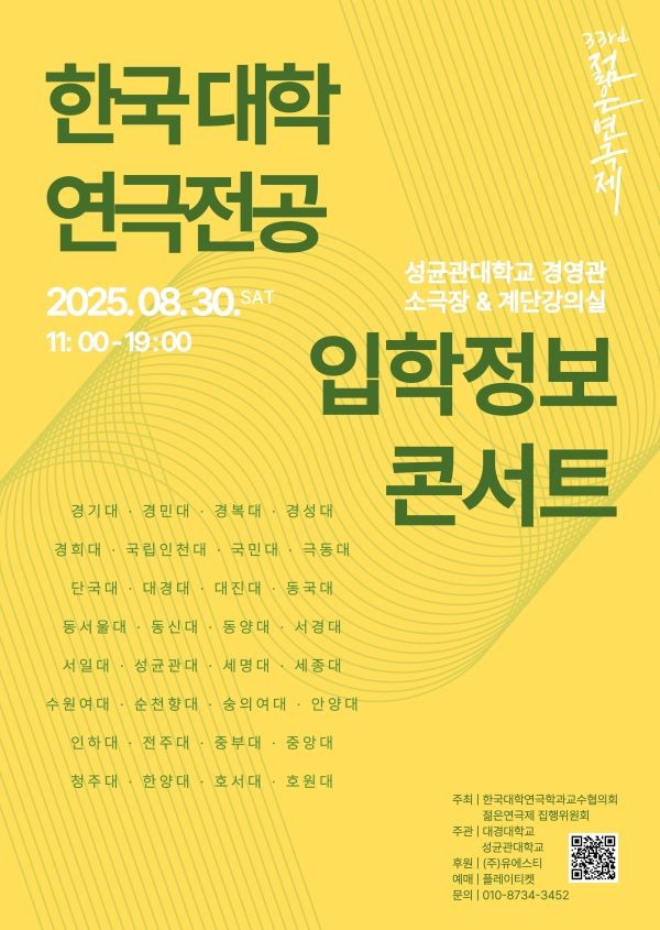 [프라임경제] 국내 33개 대학이 참여하고 전공 교수 100여 명, 연기·연극 전공 희망자 1500여 명이 참가하는 국내 최대 규모의 '2026 한국대학 연극전공 입학정보 콘서트'가 오는 30일 성균관대학교에서 열린다.