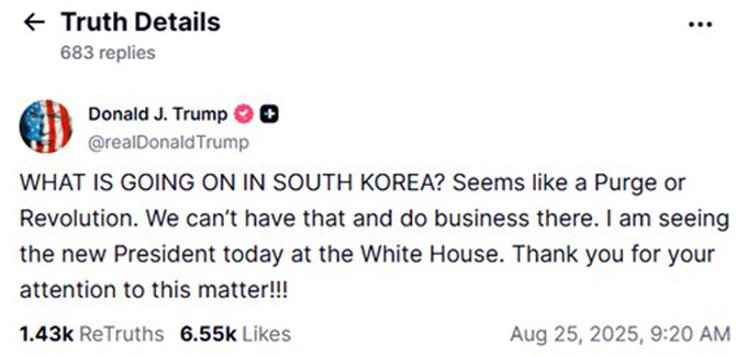 이날 정상회담에 앞서 트럼프 대통령은 트루스소셜에 "한국에서 무슨 일이 일어나고 있나. 마치 숙청이나 혁명이 벌어지는 것 같다"며 "이런 상황에서는 한국에서 사업을 할 수 없다"고 말해 한미정상회담이 어렵게 흘러갈 것이라는 우려가 있었지만 우호적인 분위기에서 이뤄졌다.