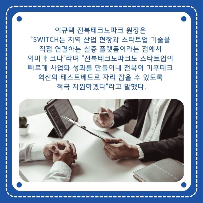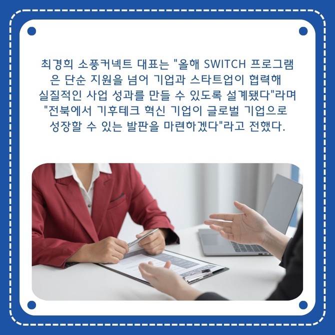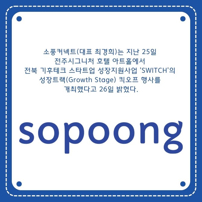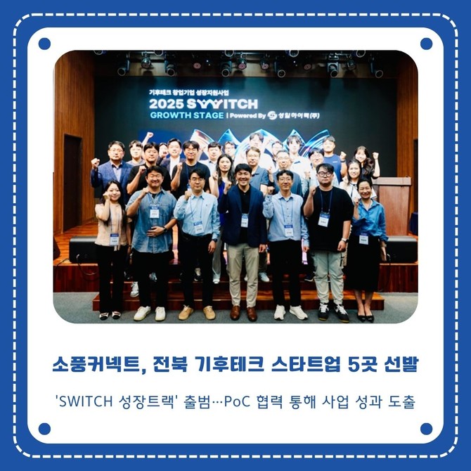 [프라임경제] 소풍커넥트(대표 최경희)는 지난 25일 전주시그니처 호텔 아트홀에서 전북 기후테크 스타트업 성장지원사업 'SWITCH'의 성장트랙(Growth Stage) 킥오프 행사를 개최했다고 26일 밝혔다.