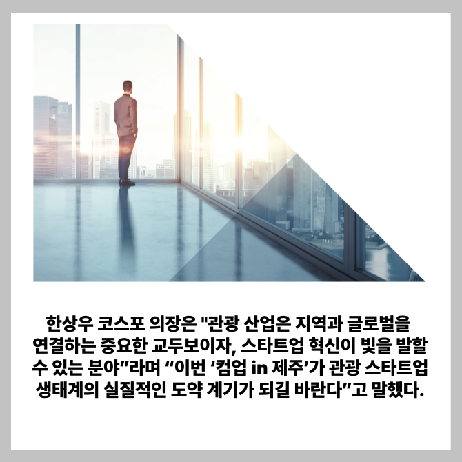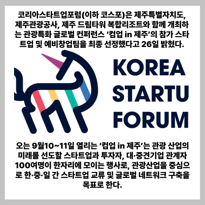[프라임경제] 코리아스타트업포럼(이하 코스포)은 제주특별자치도, 제주관광공사, 제주 드림타워 복합리조트와 함께 개최하는 관광특화 글로벌 컨퍼런스 '컴업 in 제주'의 참가 스타트업 및 예비창업팀을 최종 선정했다고 26일 밝혔다.