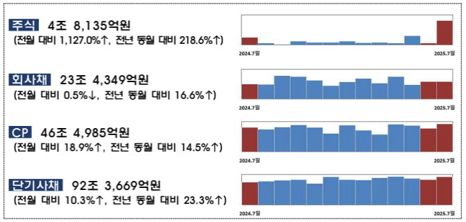 26일 금융감독원이 공개한 '7월 중 기업의 직접금융 조달실적'에 따르면 지난달 주식발행 금액은 4조8135억원으로 전월(3923억원) 대비 1127% 급증했다.