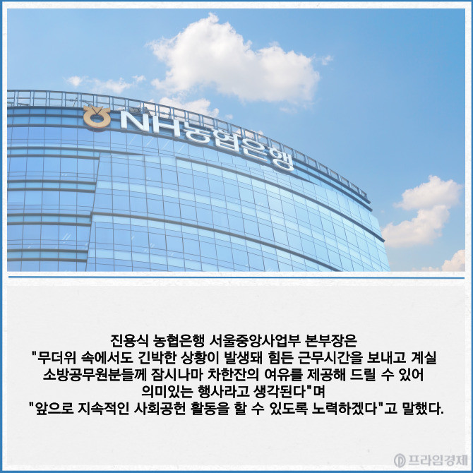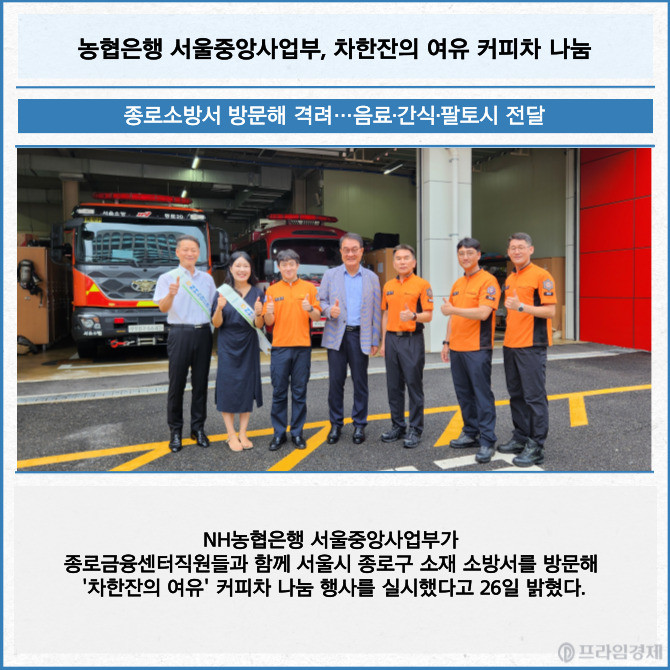 [프라임경제] NH농협은행 서울중앙사업부가 종로금융센터직원들과 함께 서울시 종로구 소재 소방서를 방문해 '차한잔의 여유' 커피차 나눔 행사를 실시했다고 26일 밝혔다.