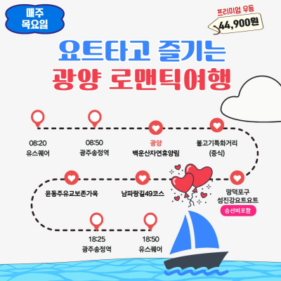 전남 광양시가 다채로운 특별코스로 구성된 남도한바퀴 가을 테마 '요트 타고 즐기는 광양로맨틱여행'을 오는 9월4일 첫 운행해 투어 일정은 유스퀘어, 송정역, 백운산자연휴양림, 불고기특화거리, 망덕포구 요트 체험, 남파랑길 49코스, 윤동주 유고 보존 가옥을 거쳐 송정역, 유스퀘어로 돌아오는 코스다.