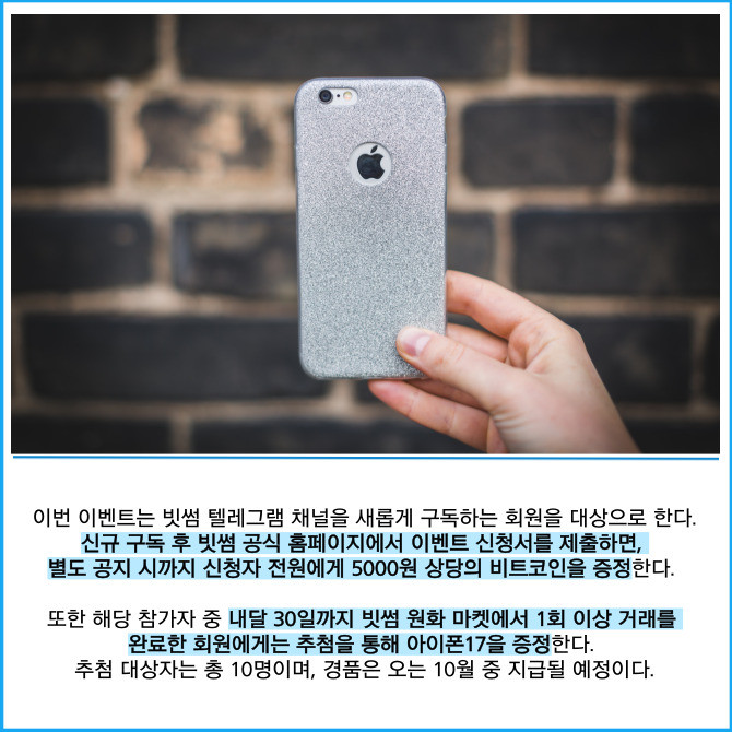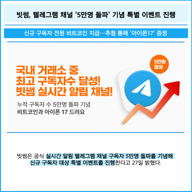 [프라임경제] 빗썸은 공식 실시간 알림 텔레그램 채널 구독자 5만명 돌파를 기념해 신규 구독자 대상 특별 이벤트를 진행한다고 27일 밝혔다.