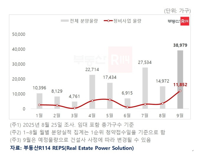 부동산R114에 따르면, 9월 전국 아파트 분양 예정 물량은 53개 단지 3만8979가구(임대 포함)다. 이중 정비사업 물량만 1만1852가구로, 전체 약 30%를 차지한다. 이는 2023년 10월(1만2581가구) 이후 약 2년 만에 최대 수준이다.