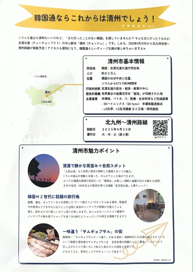청주시는 거점 항공사인 에어로케이와 협력해 하반기에 신규 취항하는 기타큐슈·오키나와 등 4개 도시와 기존 운항 중인 오비히로·이바라키 등 일본 소도시를 대상으로 홍보 활동을 전개할 예정이다.
