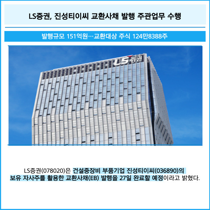 [프라임경제] LS증권(078020)은 건설중장비 부품기업 진성티이씨(036890)의 보유 자사주를 활용한 교환사채(EB) 발행을 27일 완료할 예정이라고 밝혔다.