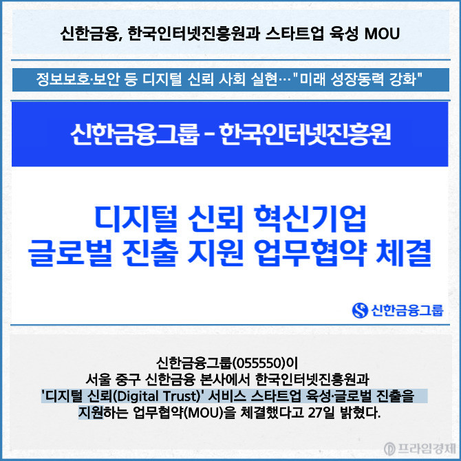 [프라임경제] 신한금융그룹(055550)이 서울 중구 신한금융 본사에서 한국인터넷진흥원과 '디지털 신뢰(Digital Trust)' 서비스 스타트업 육성·글로벌 진출을 지원하는 업무협약(MOU)을 체결했다고 27일 밝혔다.