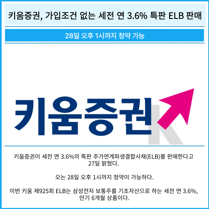 [프라임경제] 키움증권(039490)이 세전 연 3.6%의 특판 주가연계파생결합사채(ELB)를 판매한다고 27일 밝혔다.