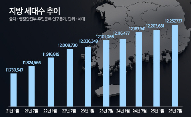 행정안전부 주민등록 인구통계 자료에 따르면, 지방(수도권 제외) 세대수는 2021년 1월 1175만547가구에서 2025년 7월 기준 1225만7737가구로, 4년 반 만에 50만 가구 이상 증가했다.