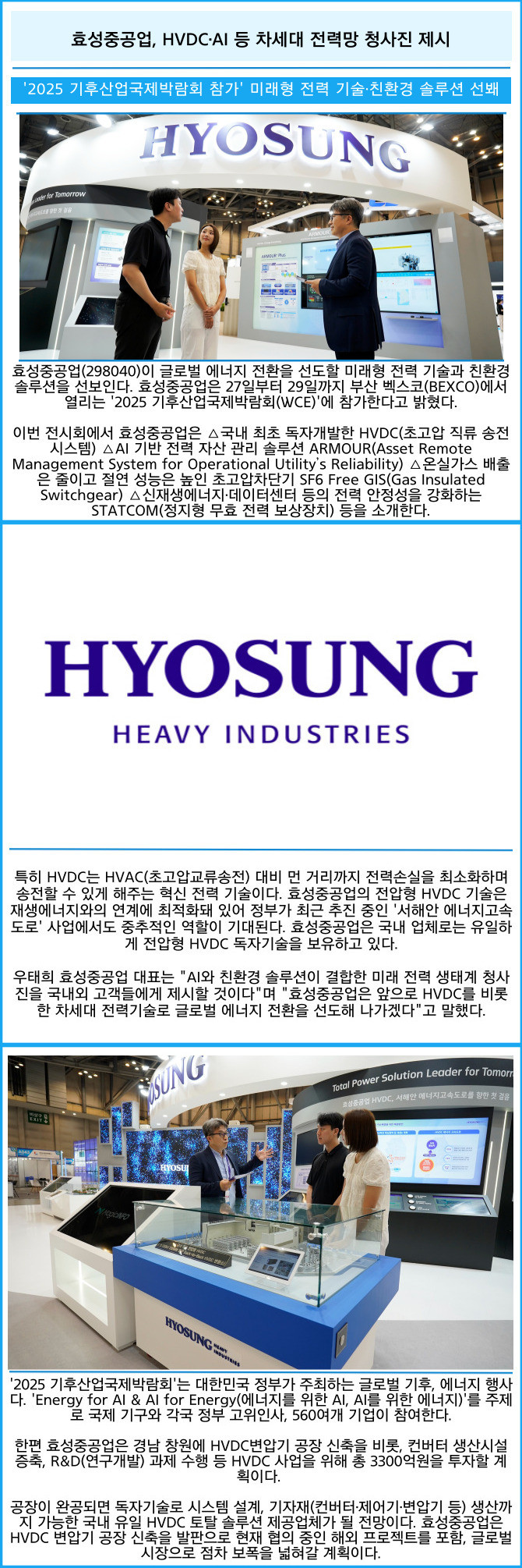 [프라임경제] 효성중공업(298040)이 글로벌 에너지 전환을 선도할 미래형 전력 기술과 친환경 솔루션을 선보인다. 효성중공업은 27일부터 29일까지 부산 벡스코(BEXCO)에서 열리는 '2025 기후산업국제박람회(WCE)'에 참가한다고 밝혔다.