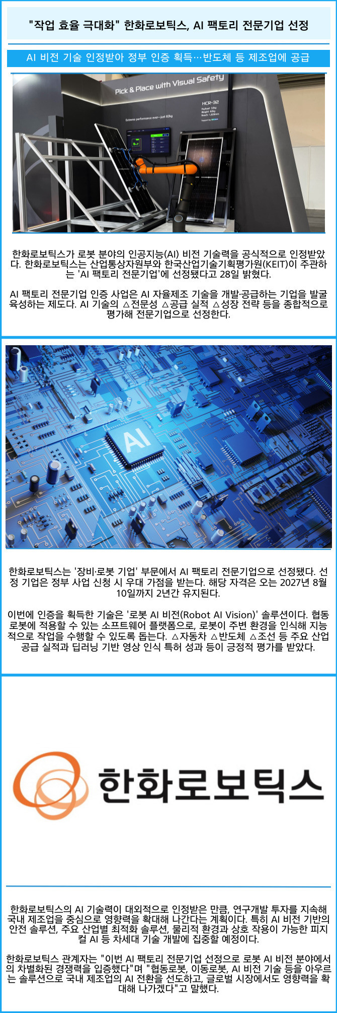 [프라임경제] 한화로보틱스가 로봇 분야의 인공지능(AI) 비전 기술력을 공식적으로 인정받았다. 한화로보틱스는 산업통상자원부와 한국산업기술기획평가원(KEIT)이 주관하는 'AI 팩토리 전문기업'에 선정됐다고 28일 밝혔다.