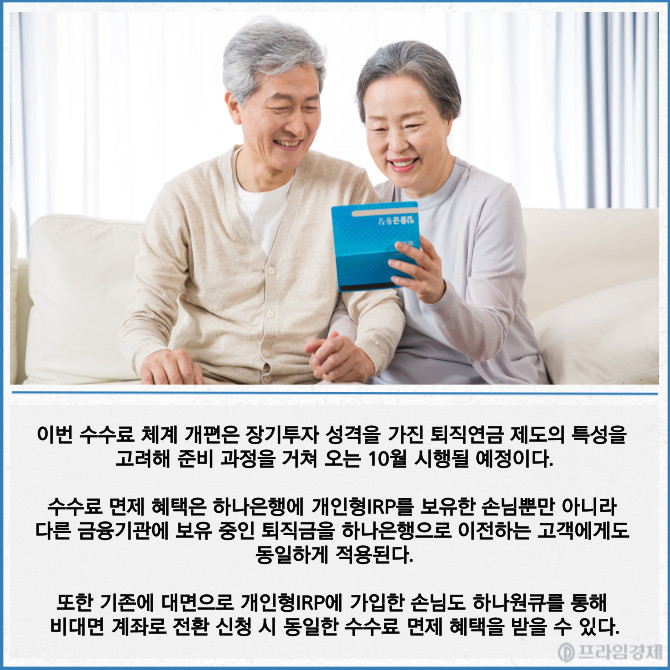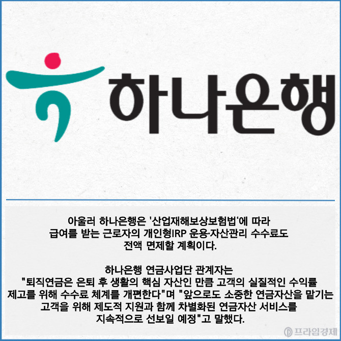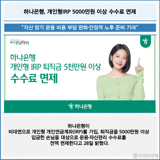[프라임경제] 하나은행이 비대면으로 개인형 개인연금계좌(IRP)를 가입, 퇴직금을 5000만원 이상 입금한 손님을 대상으로 운용·자산관리 수수료를 전액 면제한다고 28일 밝혔다.