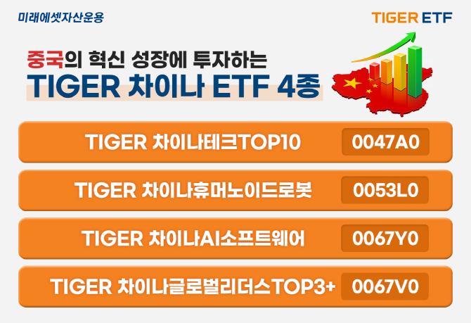 이 외에도 'TIGER 차이나AI소프트웨어', 'TIGER 차이나글로벌리더스TOP3+'는 중국 테크 기업 성장의 수혜를 누릴 수 있을 것으로 기대된다.