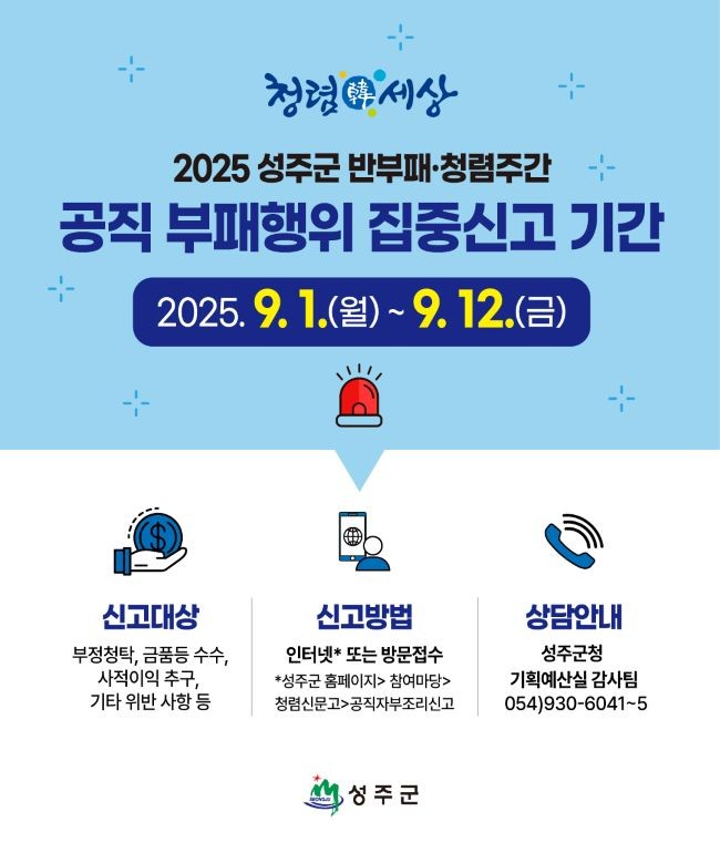 이번 집중신고기간은 '성주군 반부패·청렴 주간'의 일환으로, 공직자의 부패행위에 대한 군민의 관심과 참여를 유도하고, 청렴한 공직문화 정착을 위한 것이다.