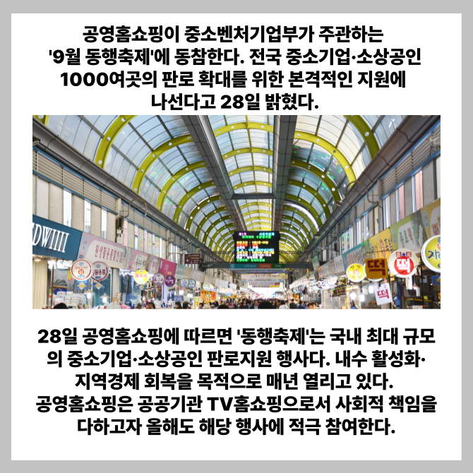 [프라임경제] 공영홈쇼핑이 중소벤처기업부가 주관하는 '9월 동행축제'에 동참한다. 전국 중소기업·소상공인 1000여곳의 판로 확대를 위한 본격적인 지원에 나선다고 28일 밝혔다.
