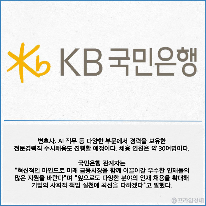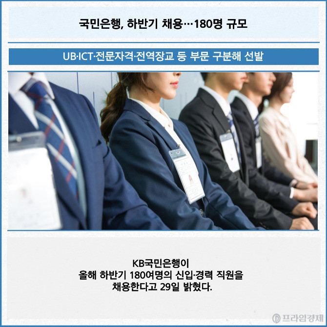 [프라임경제] KB국민은행이 올해 하반기 180여명의 신입·경력 직원을 채용한다고 29일 밝혔다.