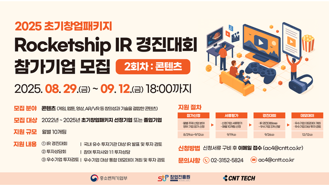 [프라임경제] 씨엔티테크(대표 전화성)가 '2025 초기창업패키지 로켓십 IR 경진대회' 2회차 참가기업 모집에 나섰다고 29일 밝혔다.