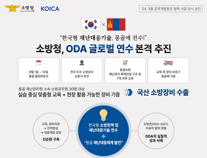 [프라임경제] 대한민국 소방청(청장 허석곤)과 한국국제협력단(KOICA)이 주관하는 '몽골 대상 소방 ODA 글로벌 연수사업'이 1일부터 12일까지 몽골 울란바토르에서 열린다.