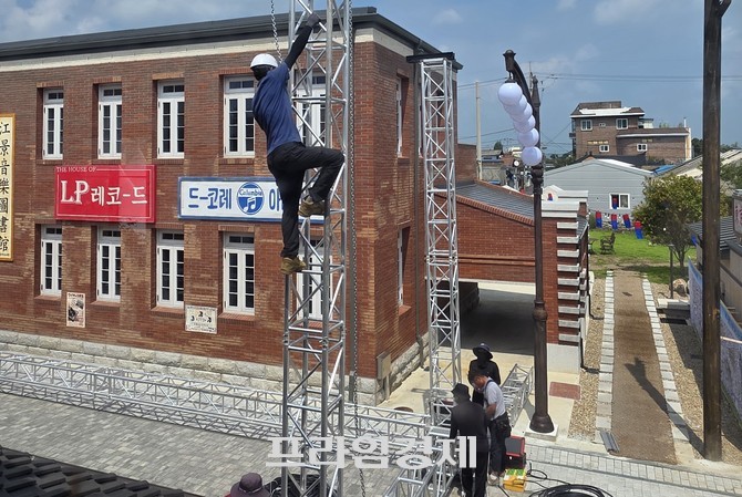 지난 8월28일 강경 구(舊) 근대건축물 거리에서는 축제 무대를 설치하던 한 작업자가 안전벨트와 추락방지 장치 없이 철제 구조물을 맨몸으로 오르내렸다. 일부 근로자는 안전모만 착용한 채 수 미터 높이에서 작업을 이어갔고, 현장에는 안전망이나 보호 장치조차 마련돼 있지 않았다.