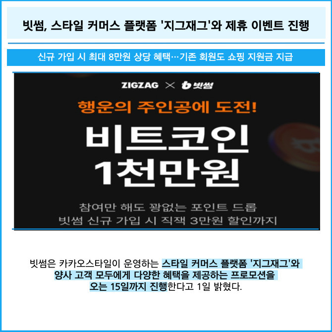 [프라임경제] 빗썸은 카카오스타일이 운영하는 스타일 커머스 플랫폼 '지그재그'와 양사 고객 모두에게 다양한 혜택을 제공하는 프로모션을 오는 15일까지 진행한다고 1일 밝혔다.