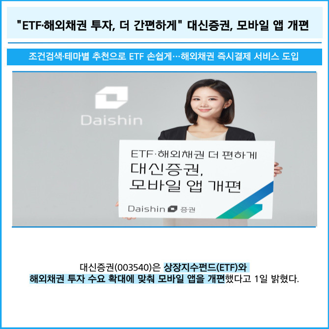 [프라임경제] 대신증권(003540)은 상장지수펀드(ETF)와 해외채권 투자 수요 확대에 맞춰 모바일 앱을 개편했다고 1일 밝혔다.