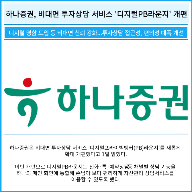 [프라임경제] 하나증권은 비대면 투자상담 서비스 '디지털프라이빅뱅커(PB)라운지'를 새롭게 확대 개편했다고 1일 밝혔다.