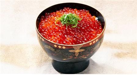 갓 지은 밥에 술과 간장으로 절인 연어알을 듬뿍 올린 요리다.