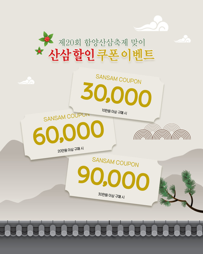 이번 할인 행사는 9월18일부터 22일까지 열리는 '제20회 함양산삼축제'와 연계한 행사로 산삼 제품에 관심 있는 소비자들에게 산삼 제품에 한해, 10만원 이상 구매 시 3만원 할인, 20만원 이상 구매 시 6만원 할인, 30만원 이상 구매 시 9만원 할인 쿠폰을 제공할 예정이다.