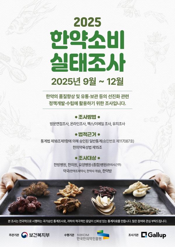 한편, 실태조사 결과는 내년 초 공표될 예정이며 한방의료이용 및 한약소비실태조사 누리집을 통해 확인할 수 있다.