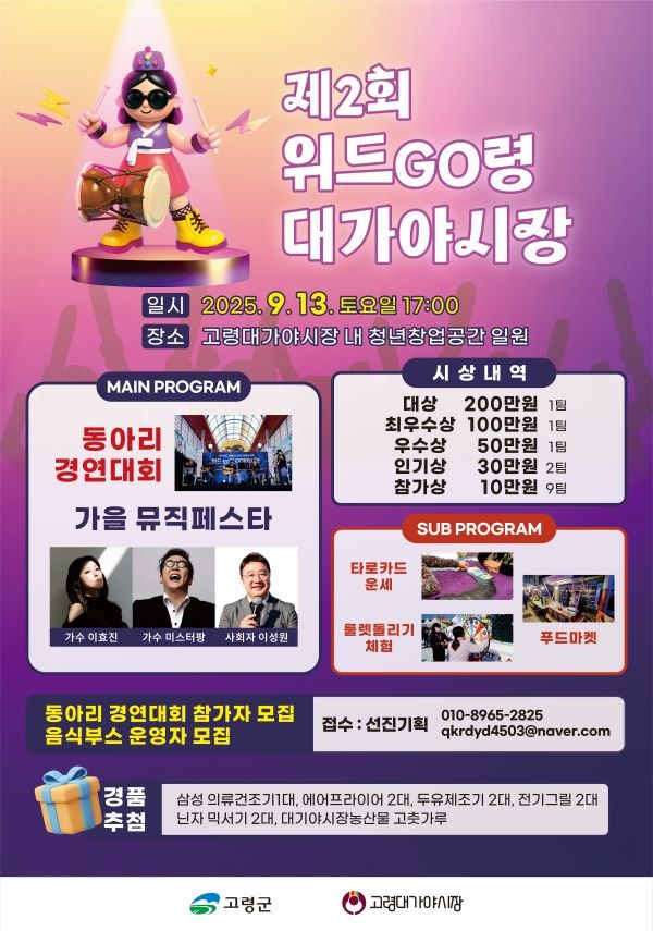 고령대가야시장 내 청년창업공간 일원에서 열리는 '위드GO령 대가야시장'에는 대구·경북권 14개 팀이 참가하는 동아리 경연대회를 메인행사로, 인기가수가 함께하는 가을 뮤직페스타, 플리마켓 및 푸드마켓, 고객 체험행사 등 다양한 볼거리와 즐길 거리로 채워 초가을 밤을 지역과 세대를 뛰어넘는 지역민들의 재능과 열정, 화합의 장으로 물들일 예정이다.